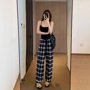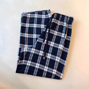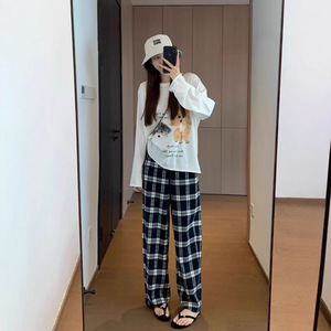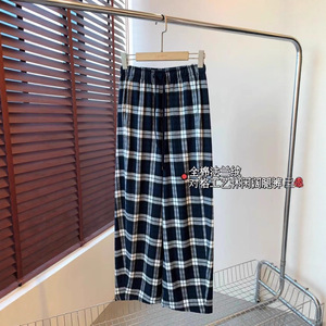 A299222软糯柔韧 100%长绒棉磨毛工艺宽松直筒松紧腰对格纹休闲裤