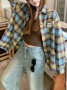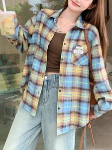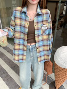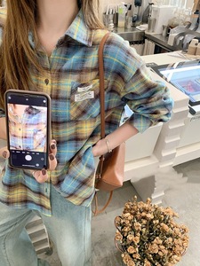 韩系撞色格子衬衫外套女秋季宽松慵懒风长袖衬衣开衫上衣