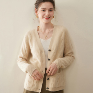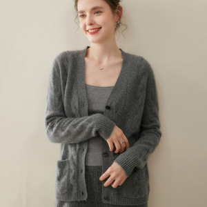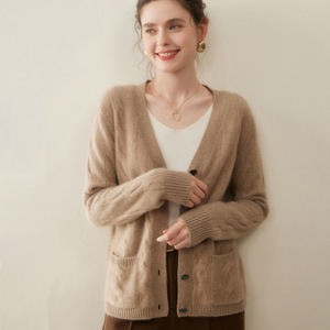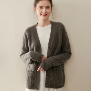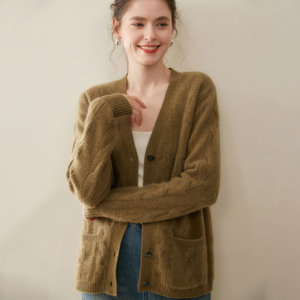 秋冬新款山羊绒开衫女V领宽松加厚针织毛衣绞花洋气系扣外套上衣
