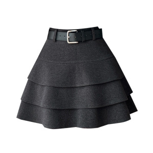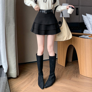设计感腰带款毛呢短裙蛋糕裙秋冬新款高腰显瘦A字裙气质半身裙子