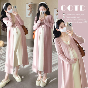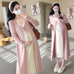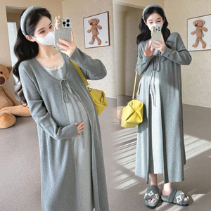 2025秋冬新款孕妇套装甜美假两件蕾丝拼接针织撞色系带孕妇连衣裙