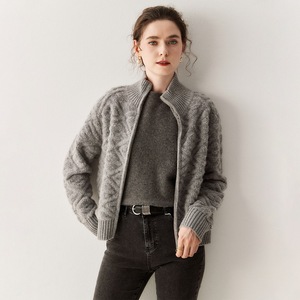 秋冬新款山羊绒衫女拉链开衫半高领毛巾绣长袖外套气质减龄短款衫
