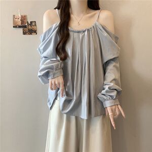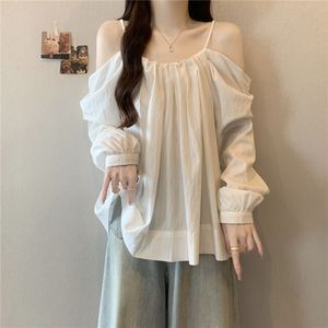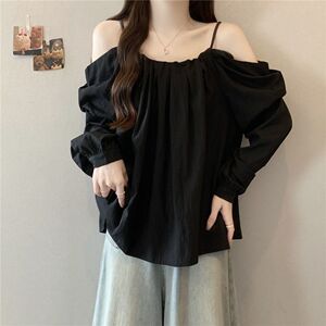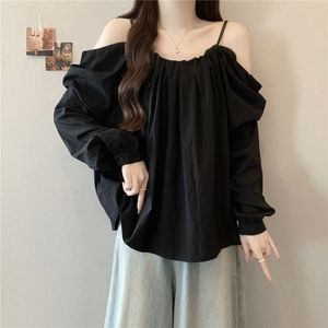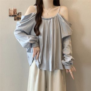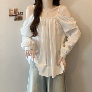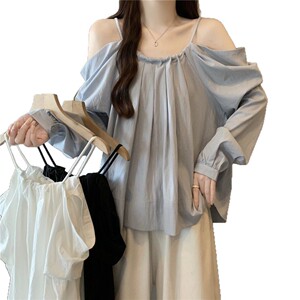 大码抽绳吊带一字肩长袖衬衫女秋季新款胖mm时尚气质减龄百搭上衣