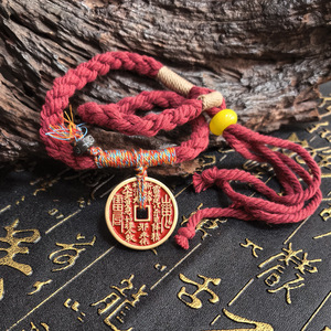 【龙虎山直发】黄铜山鬼花钱吊坠朱砂手链民族风编织古币手绳串