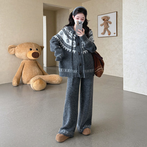 孕妇套装秋冬连帽牛角扣开衫加厚时尚毛衣休闲阔腿裤孕妇套装