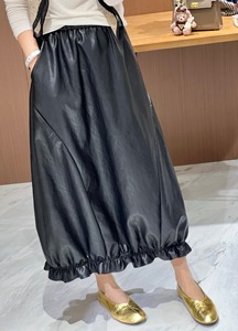 南油代发PU皮松紧腰花苞半裙2025新款时尚设计下摆木耳边中长裙女