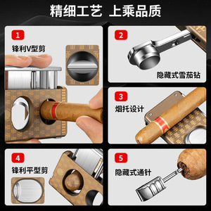 古巴图案五合一多功能不锈钢雪茄剪带雪茄钻烟托雪茄通针V切口