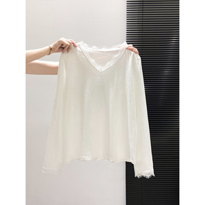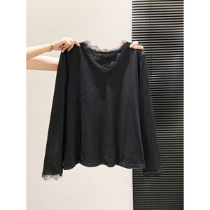 纯欲风V领蕾丝边长袖t恤女春秋季休闲打底衫叠穿气质百搭内搭上衣