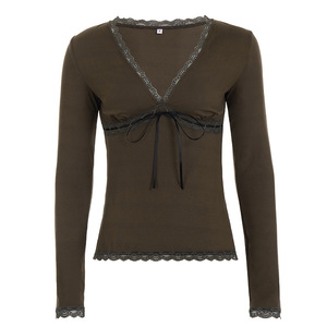 辣妹V领蕾丝拼接蝴蝶结系带长袖复古修身显瘦T恤内搭打底衫上衣秋