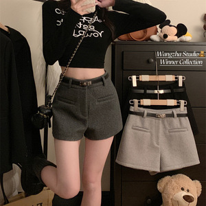 深灰色复古休闲短裤女秋季毛呢靴裤百搭高腰包臀a字裤子直筒热裤