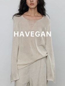 与间HAVEGAN/秋季v领天丝亚麻长袖设计感针织衫女宽松老钱风衣