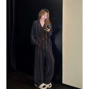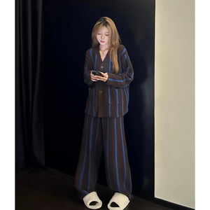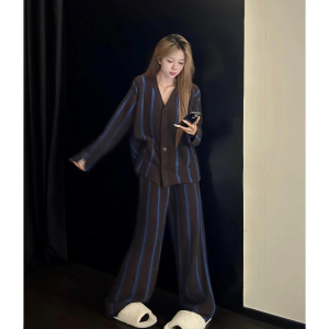 韩系条纹半边绒睡衣女款冬季新款保暖加绒加厚长袖家居服套装大码