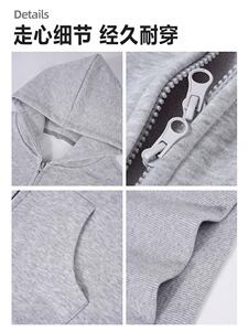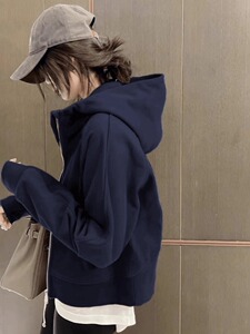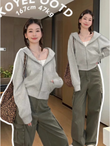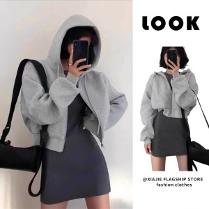灰色短款连帽卫衣拉链初秋外套女春秋修身小个子韩系开衫上衣秋季