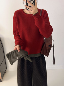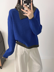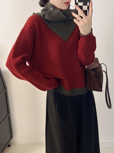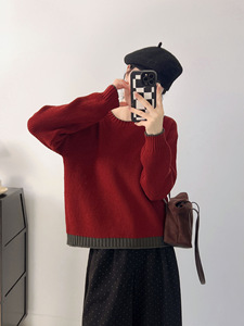 2025秋冬新款可拆卸围脖圆领套头毛衣女宽松设计感撞色针织衫上衣