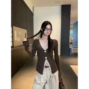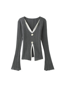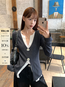 宋正恩灰色假两件针织衫女秋季修身显瘦长袖高级感慵懒毛衣小上衣