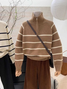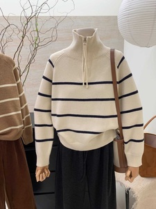 半拉链高领条纹套头毛衣女冬季加厚宽松百搭外穿长袖休闲上衣外套