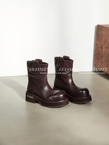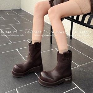 欧洲站女鞋25冬时尚软植鞣胎牛皮大圆头休闲厚底套筒切尔西皮短靴