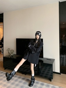 2025新款设计感黑色翻领西装外套女装秋季复古宽松中长款西服上衣