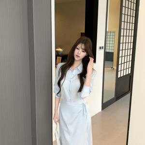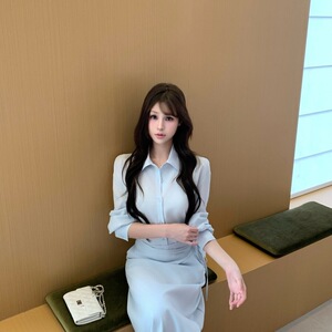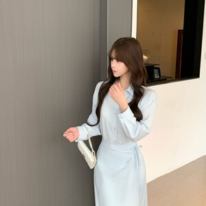 假两件蓝色衬衫连衣裙女早秋季小众设计显瘦气质POLO长裙御姐气质