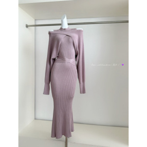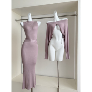 香芋紫露肩长袖毛衣针织罩衫女秋季套装背心连衣裙鱼尾裙子两件套