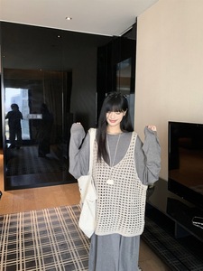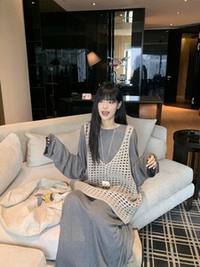 慵懒风套装宽松长袖连衣裙女装秋季叠穿镂空渔网大背心马甲两件套