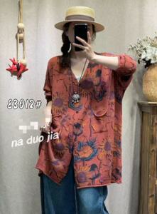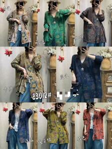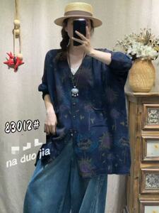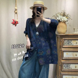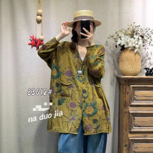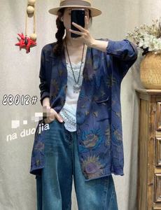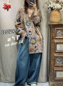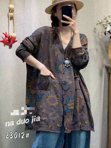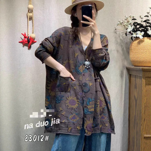 2025秋韩版宽松文艺范针织印花V领中长款外套百搭休闲毛衣女83012