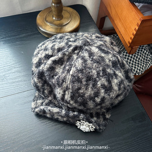 秋冬款豹纹圈圈毛绒八角帽子女保暖时尚加厚画家帽复古