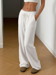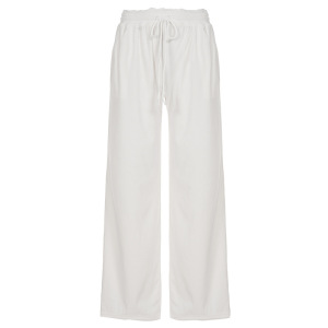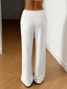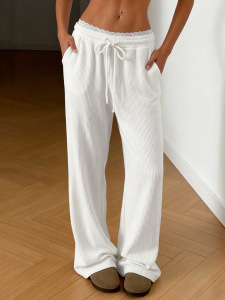 欧美新款休闲舒适宽松灯芯绒蕾丝纯色拼接腰头系带直筒阔腿长裤