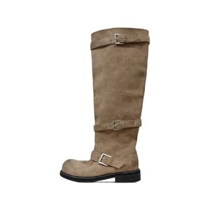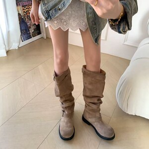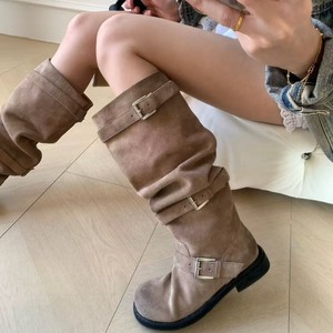 张元英同款皮带扣堆堆靴女粗跟复古做旧中筒靴褶皱西部牛仔骑士靴