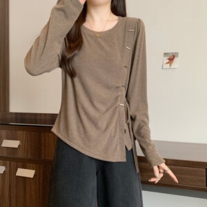实拍2025秋季胖mm大码不规则系带正肩长袖T恤设计感遮肚上衣80556