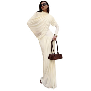 欧美风2025秋冬新批发女装气质修身纯色圆领收腰褶皱长袖连衣裙女