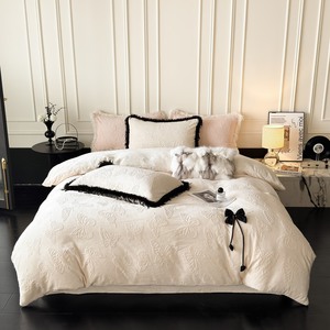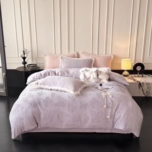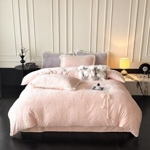 A类奶油风秋冬牛奶绒四件套唯美蝴蝶雕花保暖加厚加绒床单被套