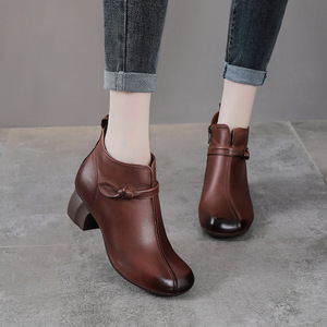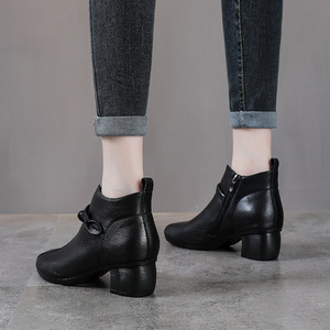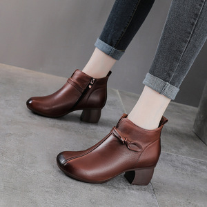 真皮马丁靴女秋冬新款短筒单靴复古头层牛皮中跟粗跟增高手工靴子