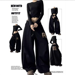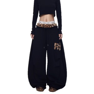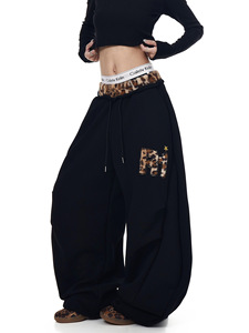美式复古辣妹纯欲毛绒豹纹刺绣拼接阔腿卫裤女嘻哈爵士舞弯刀裤子