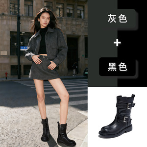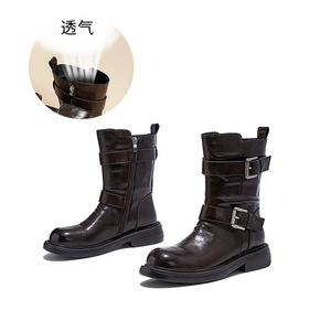 真皮复古马丁靴女2025冬季新款英伦风一字扣带瘦瘦靴百搭洋气短靴