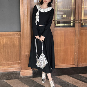 赫本显瘦【南艺】法式气质波点飘带领拼黑色连衣裙女高ji感收腰裙
