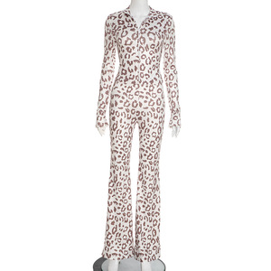 C25ST275欧美女装秋季新款豹纹印花圆领长袖上衣修身喇叭长裤套装