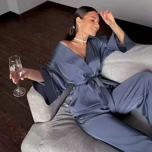 25欧美跨境外贸长袖开衫系带睡袍套装女欧美家居宽松长裤睡衣套装