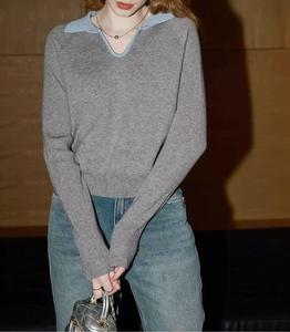 灰色长袖针织衫女2025年秋季新款名媛气质V领翻领小毛衣