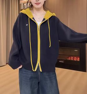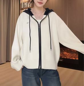 撞色连帽针织衫外套女秋冬2025新款韩版慵懒风双拉链加厚毛衣开衫