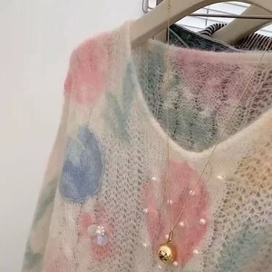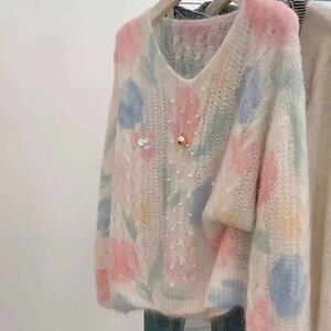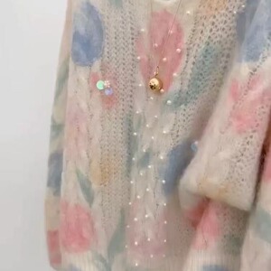 设计感巨好看的粉色提花宽松针织衫上衣法式小香风v领珍珠毛衣女