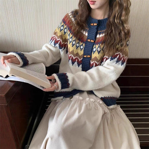费尔岛牛角扣提花圆领针织开衫女新年圣诞宽松慵懒高级感毛衣外套