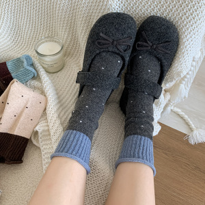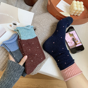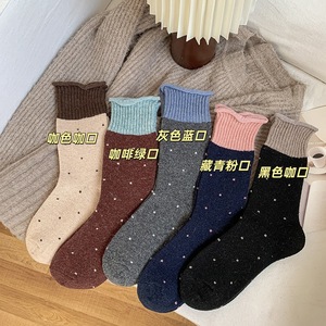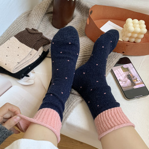 波点羊毛袜子女中筒袜秋冬款加厚加绒保暖毛绒拼接冬天长袜堆堆袜