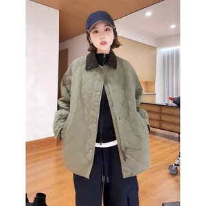 欧货时尚百搭菱形格棉服女2025冬季新款宽松休闲翻领保暖棉衣外套