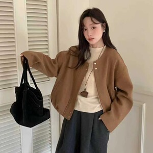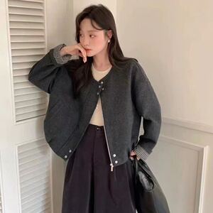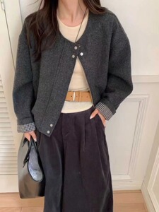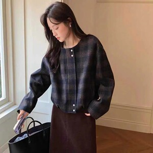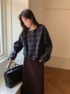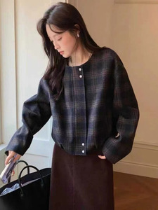 韩系圆领短款毛呢外套女欧货2025秋季新款气质时尚宽松格子上衣女