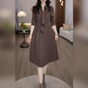秋冬新款翻领围巾系带纯色简约收腰显瘦妈妈装连衣裙气质百搭款女