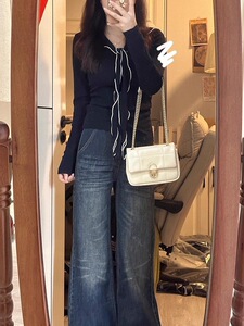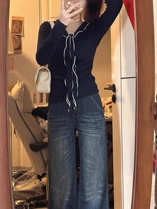 韩系藏青色v领系带长袖针织衫女早秋miu系穿搭小个子短款内搭上衣