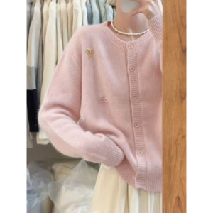韩版软糯蓝色针织开衫毛衣外套女2025秋冬新款外穿宽松浣熊绒上衣