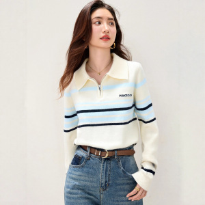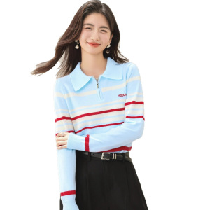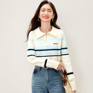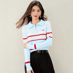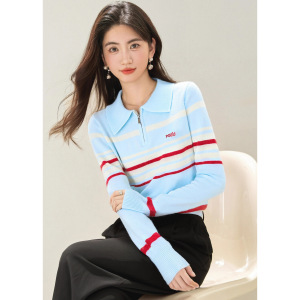 韩系Polo领拉链条纹长袖针织衫女2025秋季新款设计感修身显瘦上衣
