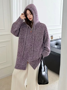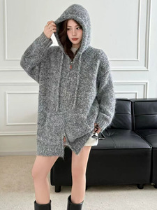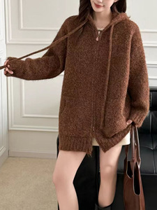 2025秋冬新款连帽拉链针织开衫韩版宽松中长款慵懒风毛衣外套女潮